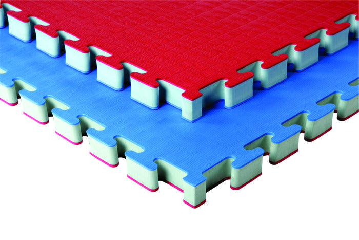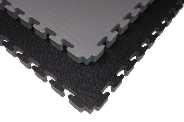 These Fuji Puzzle Mats are a quick, easy, and affordable way to mat your entire floor. It is made of a 6lb density quality EVA foam in a 1m x 1m x 40mm interlocking tile dimension and is completely waterproof. Each mat is double-sided (double colour) and truly reversible, and every order comes complete with border strips.