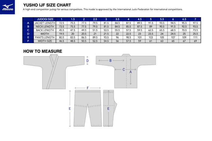 Mizuno IJF Yusho II Judo Gi height and weight size chart