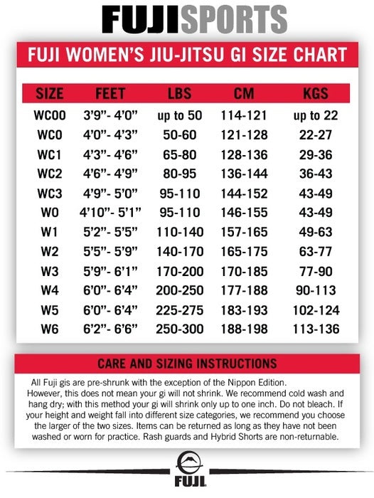 Children's sizes range from WC00 (00) to C3 and adult sizes start at W1 to W6. Children's Gi comes with a White BJJ Belt and all Gi's come with a free FUJI patch as well as a small white ribbon on both jacket and pants to show your support.