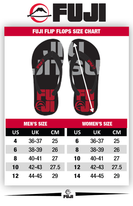 Fuji Brasileiro Flip Flops are the best way to keep your feet clean while getting to and from the gym, at a seminar or even at a comp. Made with a flexible 3 point rubber strap and slip resistant footbed the Fuji Brasileiro Flip Flops sport a Brazilian inspired design. Built for comfort and made of high-quality materials that you would expect Fuji products to be. These Flip Flops are made in Brazil. Wear them beyond the gym to the beach or around the streets.