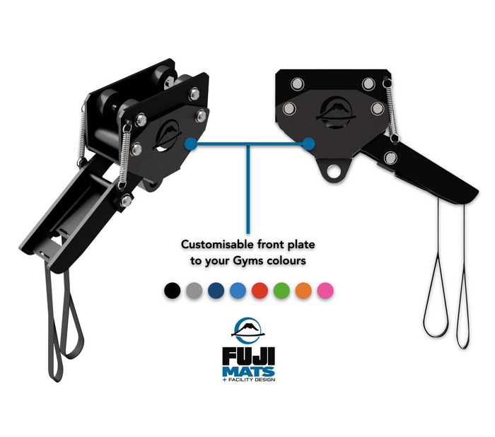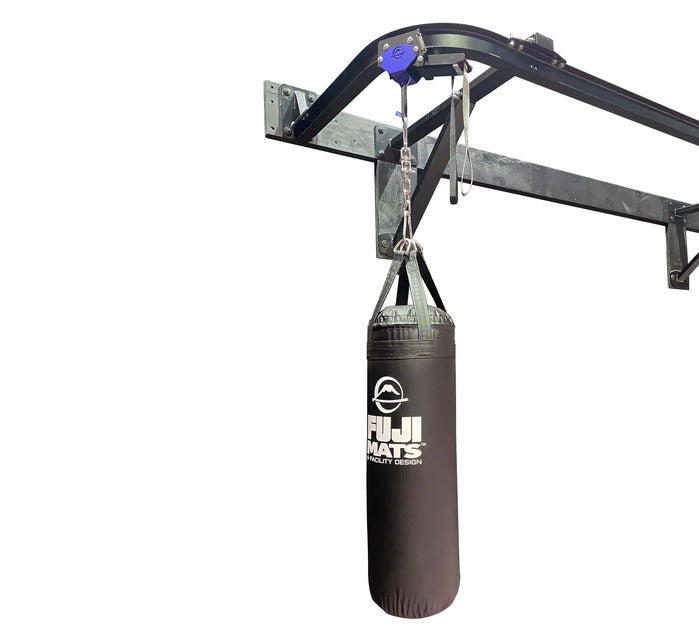 FUJIs unique Wall Mount Trolley Bag Rack System allows you to slide and lock your heavy bags in place for use. When you're ready to work takedowns and open up your floor space, simply pull the cable and slide your bags out of the way. The new wall mount design offers added clearance by suspending your rack over your mats and removing any hazards caused by posts to the floor.