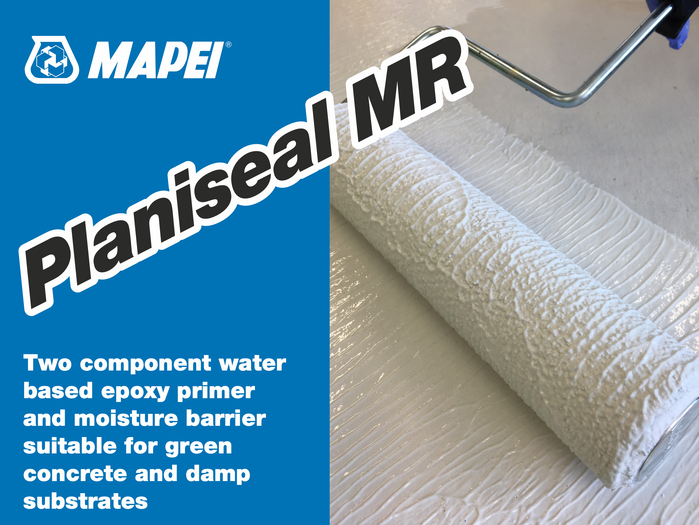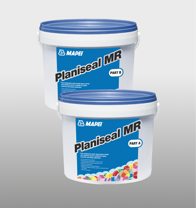 Mapei Planiseal MR is Two-component water-based epoxy primer and moisture barrier suitable for green concrete and damp substrates. Planiseal MR is a highly versatile water-based epoxy resin compound for use as a primer and protective coating to resist and prevent moisture transmission through mineral substrates. Suitable for applications directly over damp surfaces and freshly installed green concrete, screeds / cementitious toppings. Planiseal MR exhibits excellent positive and negative hydrostatic pressure resistance. Once cured, subsequent waterproofing membranes, adhesives and other finish coats can be applied.